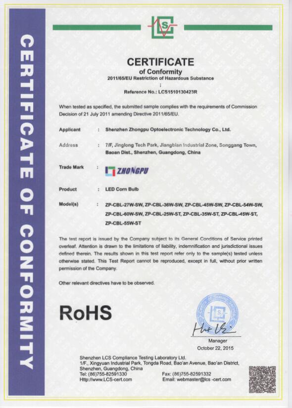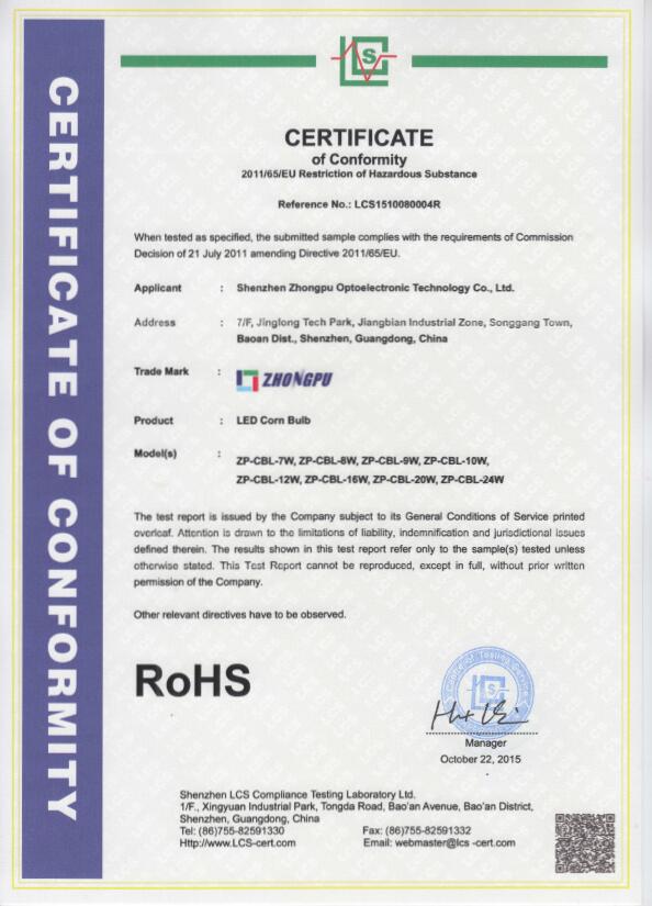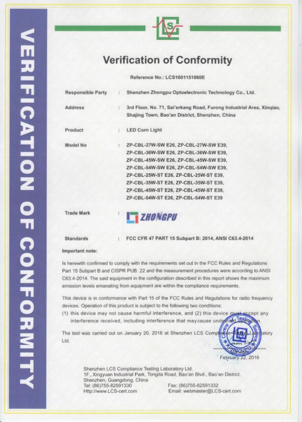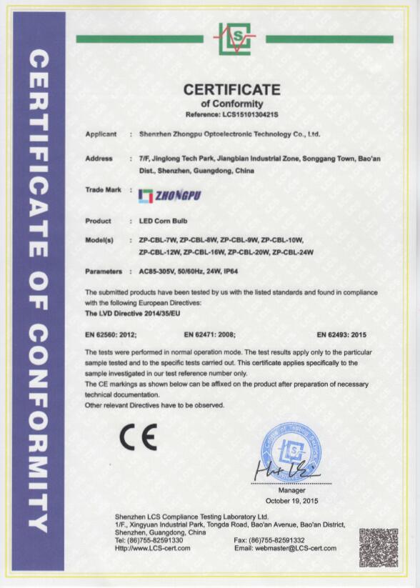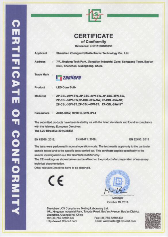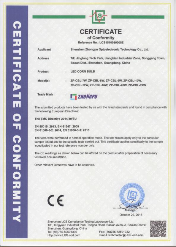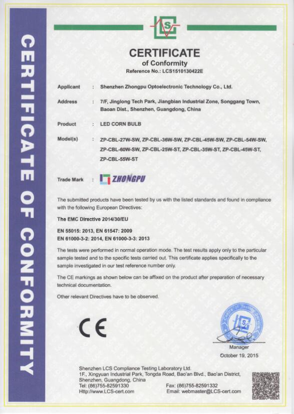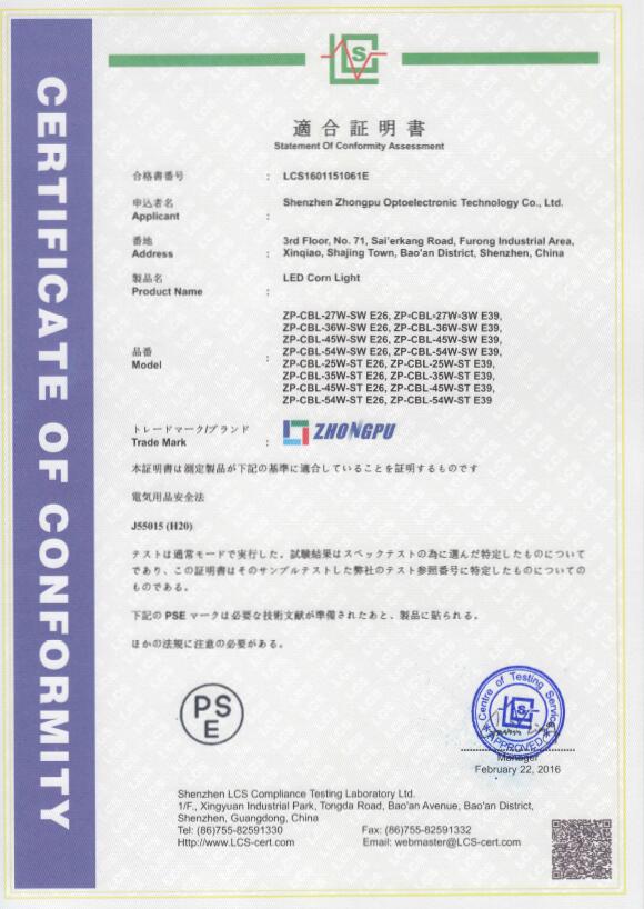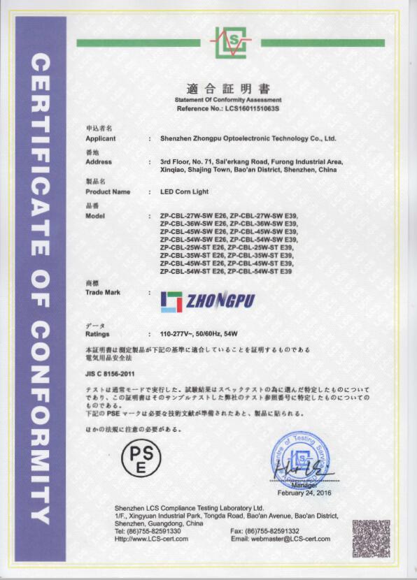 Zhongpu has been focused on led corn light and high quality led industrial light for 5 years. Up to now,CE/ROHS/PSE/FCC/ETL certifications are available, In the near future we will have DLC and other certifications.